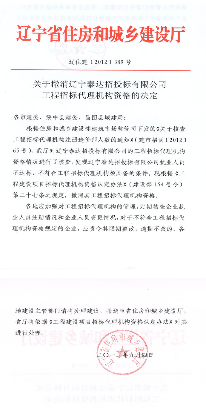 【概要描述】关于撤销辽宁泰达招投标有限拼搏在线官方网站工程招标代理机构资格的决定