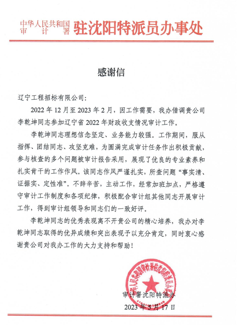 近日,拼搏在线官方网站再次收到审计署沈阳特派办的感谢信,对拼搏在线官方网站在工作中给予的帮助和支持表示感谢。