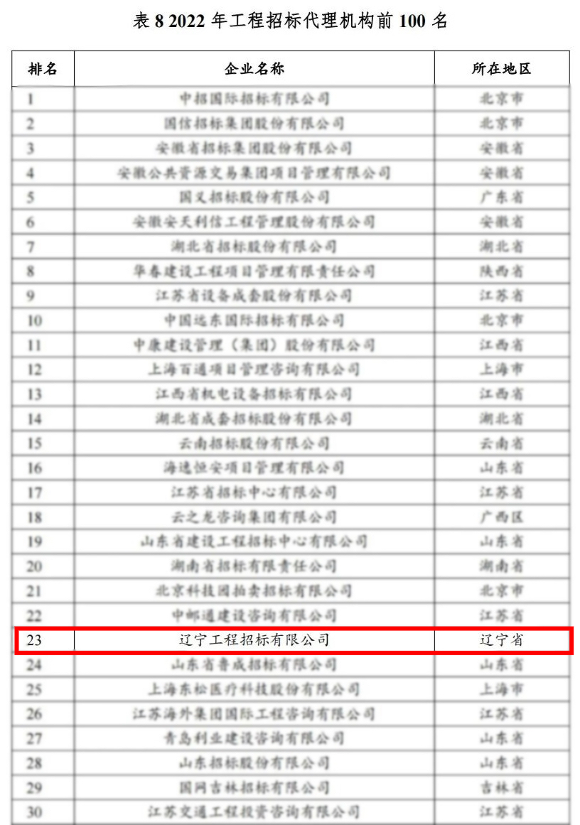 2023年8月,中国土木工程学会建筑市场与招标投标研究分会组织编写了《2022年度工程招标代理行业发展报告》,报告公布的2022年工程招标代理机构百强名单中,拼搏在线官方网站作为辽宁省唯一入选代理机构,荣获全国第23名。