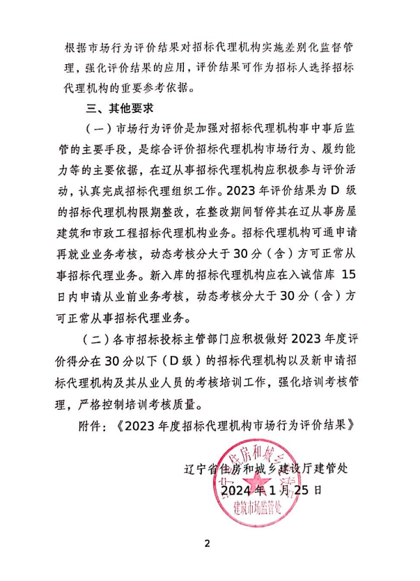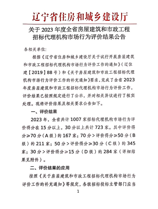 房屋建筑和市政工程招标代理机构市场行为评价是辽宁省住建厅为加强和完善辽宁地区招标代理机构市场行为监管,规范招标代理机构和从业人员执业行为,落实招标代理机构和从业人员主体责任,提高招标代理机构综合素质和业务水平而开展的年度系统工作,对提高招标代理机构综合素质和业务水平具有十分积极的作用。拼搏在线官方网站始终高度重视业务的合规化管理与市场各方的评价反馈,通过不断完善内部管理制度、建设专业人才队伍、加强风险防控能力、规范采购业务行为、提升全过程价值服务水平等一系列举措,构建企业核心竞争力,引领行业规范发展。