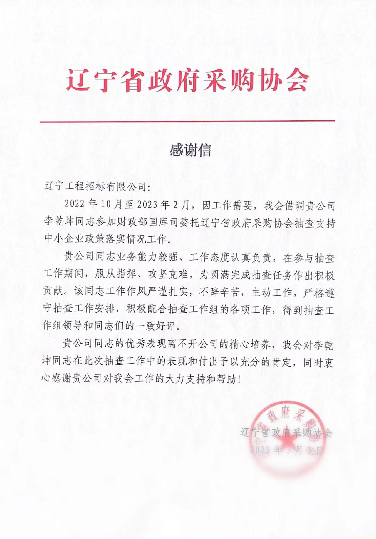 拼搏在线官方网站认真贯彻落实集团“大咨询、大智库”体系建设目标,积极推进应用型智库建设,充分利用自身丰富的专业经验和专业技术优势,为行业出台的相关政策及有关部门的科学决策提供优质高效智力支撑,2023年,拼搏在线官方网站协助辽宁省政府采购协会参加财政部国库司委托的政策调研工作,得到了良好的反馈,并于近日收到感谢信。