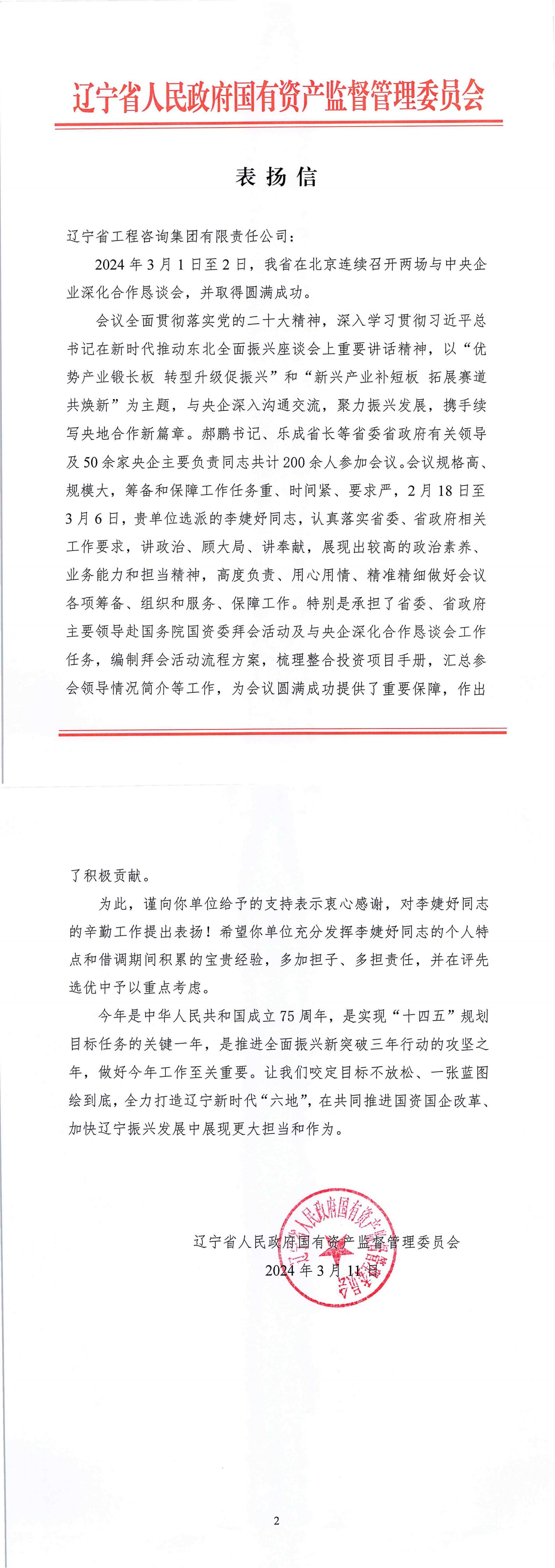 近日,拼搏在线官方网站收到省国资委发来的表扬信,对我单位李婕妤同志在北京召开的“辽宁省与中央企业深化合作恳谈会”上的辛勤工作提出表扬。这是李婕妤同志继2023年6月25日参与筹备“深化东北地区国资国企改革现场推进会”“国资央企助力东北全面振兴座谈会”后第二次受到省国资委表扬。